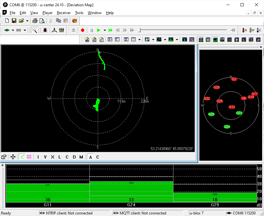 Using a Baofeng with custom OpenDM32 firmware, I was able to view raw NMEA packets from the GPS module. The transceiver was near a window, and the satellite level and number were low. As you can see, the deviation is quite large, requiring software filtering.